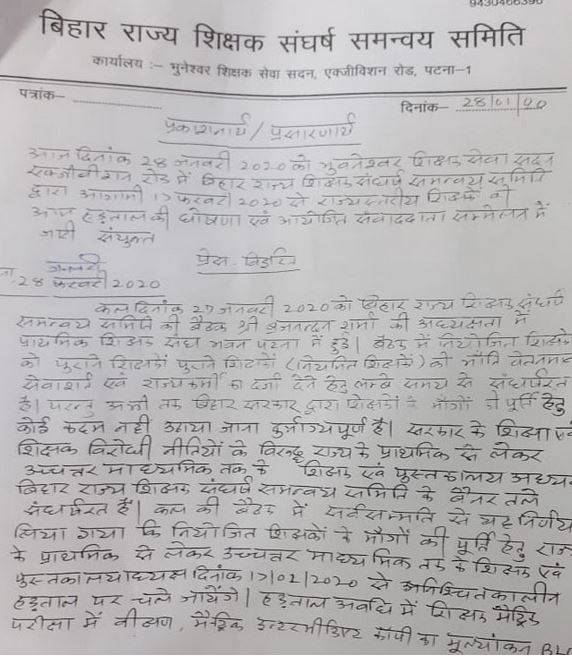 बिहार राज्य शिक्षक संघर्ष समन्वय समिति के तहत राज्य के करीब 28 छोटे-बड़े शिक्षक संघ और संगठन आगामी 17 फरवरी से सरकार के खिलाफ अनिश्चितकालीन हड़ताल शुरू करेंगे जिसे 25 फरवरी से बिहार राज्य शिक्षक संघ ने भी समर्थन देने का ऐलान किया है.